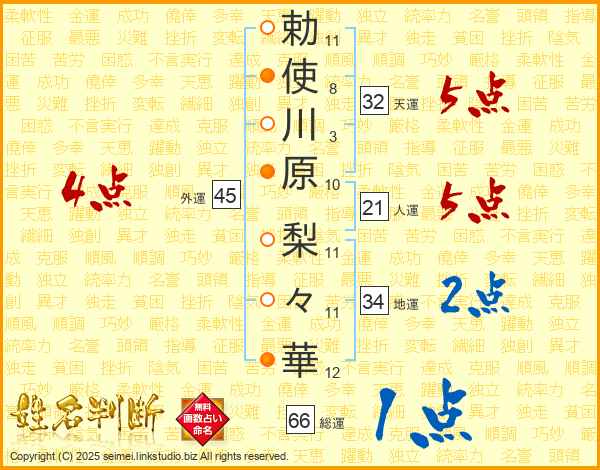 勅(11画)使(8画)川(3画)原(10画) 梨(11画)々(11画)華(12画)