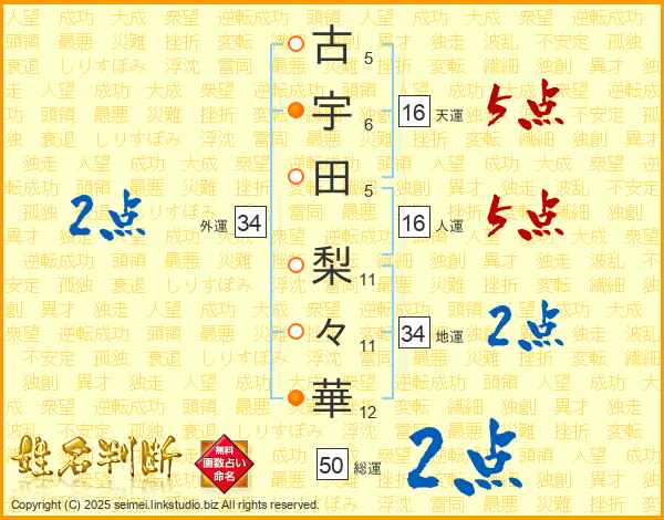 古(5画)宇(6画)田(5画) 梨(11画)々(11画)華(12画)