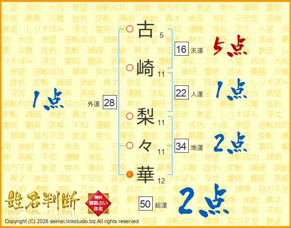 古(5画)崎(11画) 梨(11画)々(11画)華(12画)