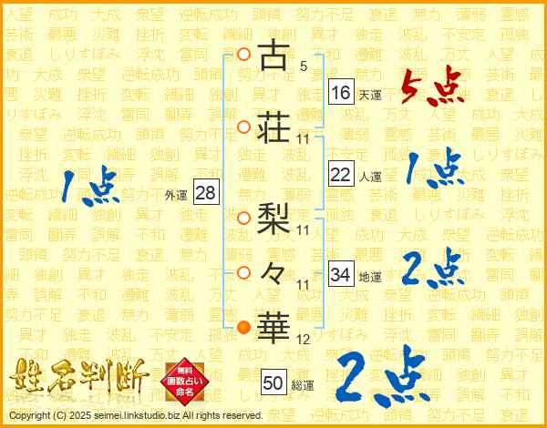 古(5画)荘(11画) 梨(11画)々(11画)華(12画)