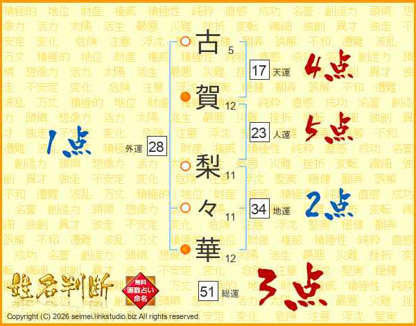 古(5画)賀(12画) 梨(11画)々(11画)華(12画)