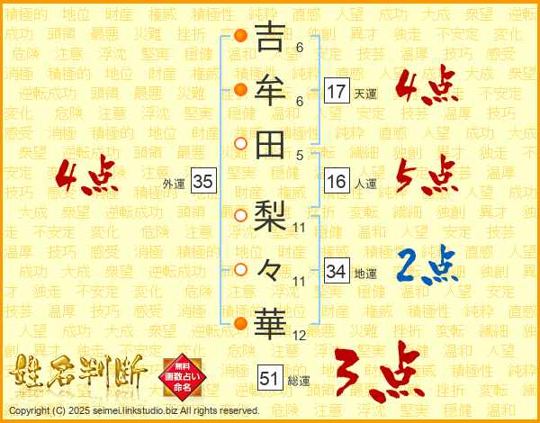 吉(6画)牟(6画)田(5画) 梨(11画)々(11画)華(12画)