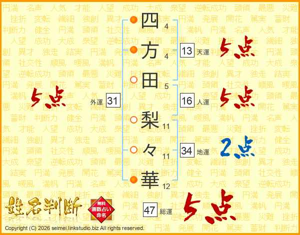 生活面を象徴する運勢です。外部から受ける影響力を表し、結婚運、家庭運や職場、環境への順応性を表します。総運から人運を引いた画数。姓や名が1文字の場合を除く。