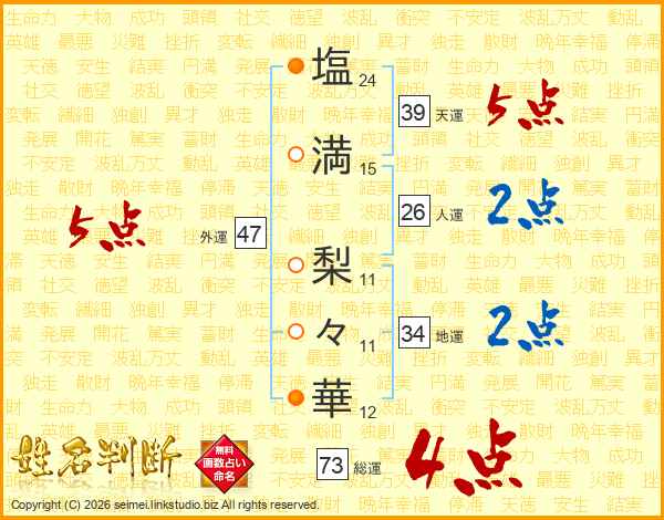 塩(24画)満(15画) 梨(11画)々(11画)華(12画)
