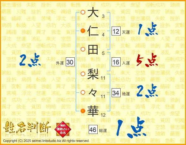 大(3画)仁(4画)田(5画) 梨(11画)々(11画)華(12画)
