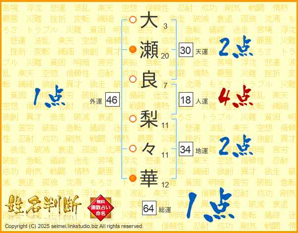 大(3画)瀬(20画)良(7画) 梨(11画)々(11画)華(12画)