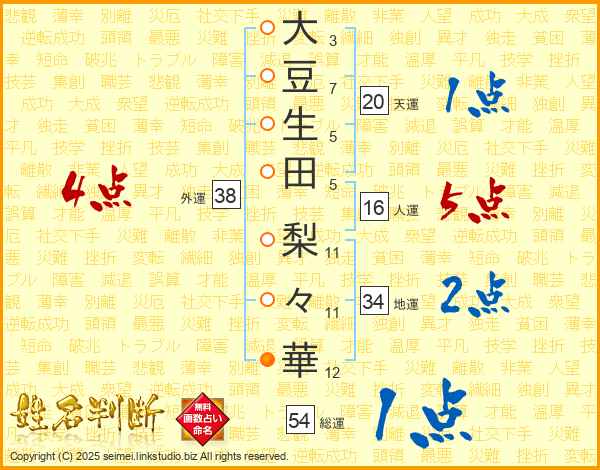 大(3画)豆(7画)生(5画)田(5画) 梨(11画)々(11画)華(12画)