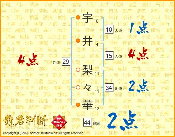 宇(6画)井(4画) 梨(11画)々(11画)華(12画)