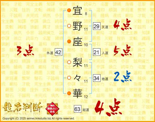 宜(8画)野(11画)座(10画) 梨(11画)々(11画)華(12画)