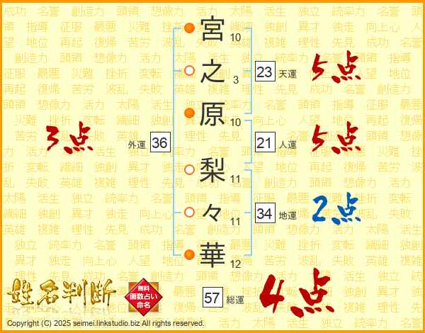 宮(10画)之(3画)原(10画) 梨(11画)々(11画)華(12画)