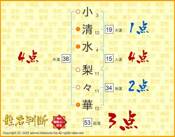 小(3画)清(12画)水(4画) 梨(11画)々(11画)華(12画)