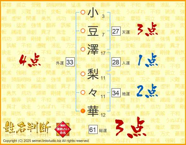 小(3画)豆(7画)澤(17画) 梨(11画)々(11画)華(12画)
