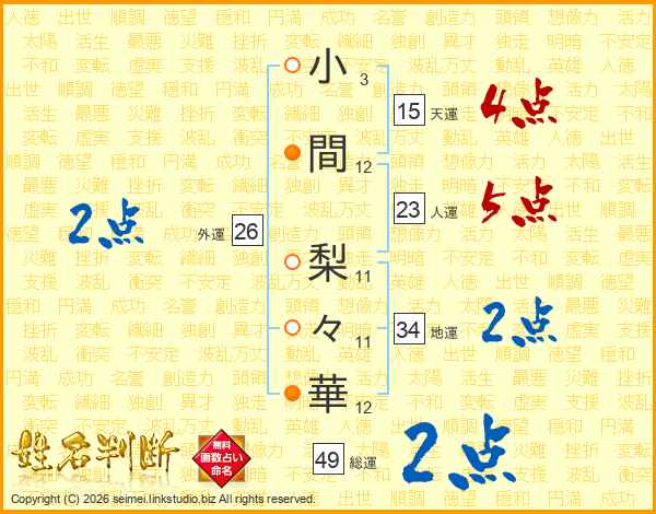 小(3画)間(12画) 梨(11画)々(11画)華(12画)