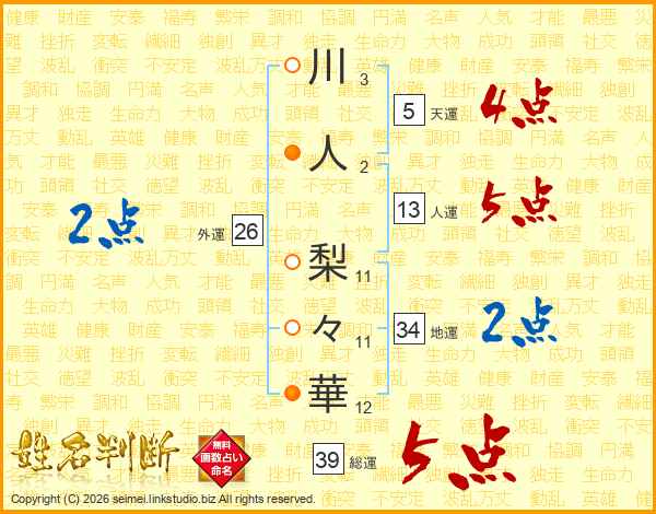 川(3画)人(2画) 梨(11画)々(11画)華(12画)