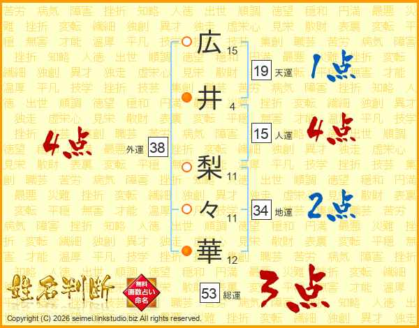広(15画)井(4画) 梨(11画)々(11画)華(12画)