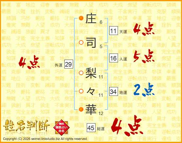 庄(6画)司(5画) 梨(11画)々(11画)華(12画)