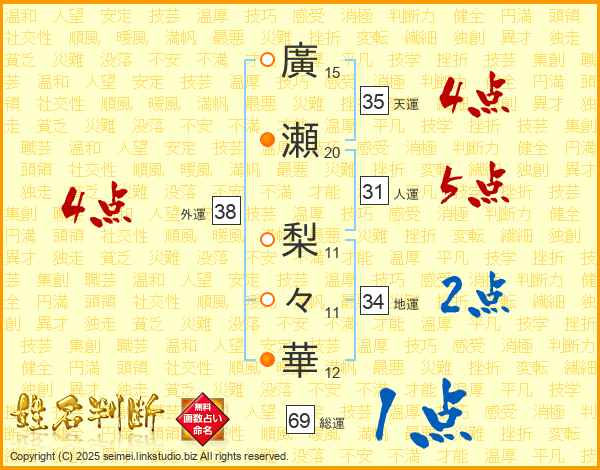 廣(15画)瀬(20画) 梨(11画)々(11画)華(12画)
