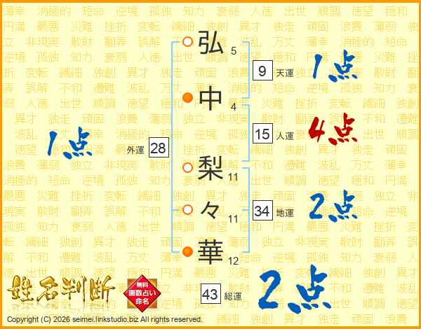 弘(5画)中(4画) 梨(11画)々(11画)華(12画)