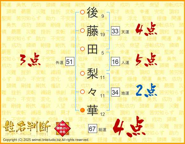 後(9画)藤(19画)田(5画) 梨(11画)々(11画)華(12画)