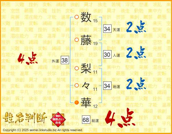 数(15画)藤(19画) 梨(11画)々(11画)華(12画)