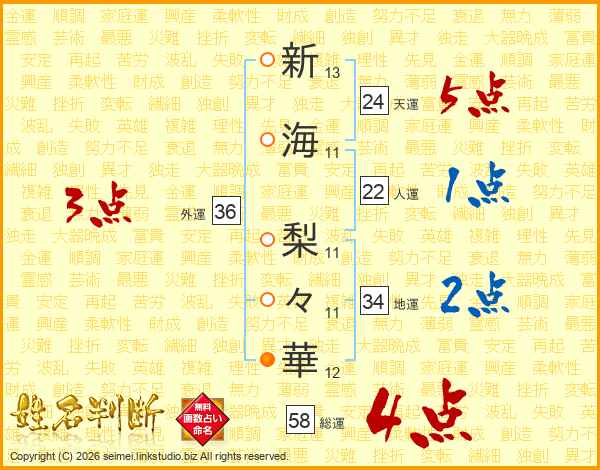 新(13画)海(11画) 梨(11画)々(11画)華(12画)