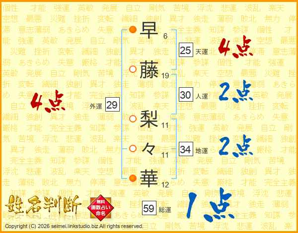 早(6画)藤(19画) 梨(11画)々(11画)華(12画)