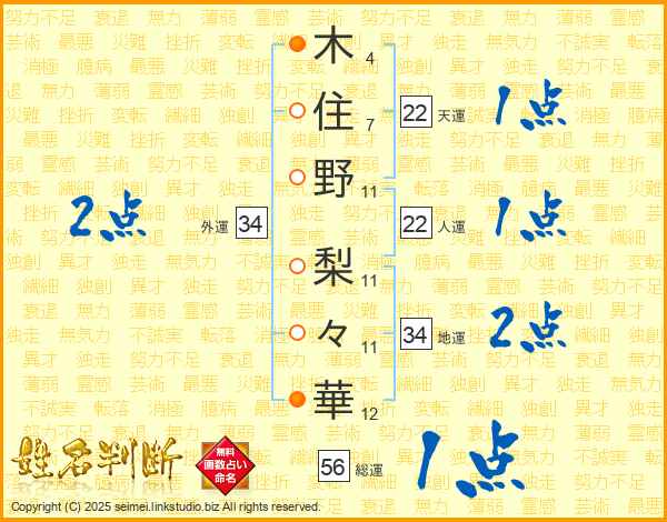 木(4画)住(7画)野(11画) 梨(11画)々(11画)華(12画)