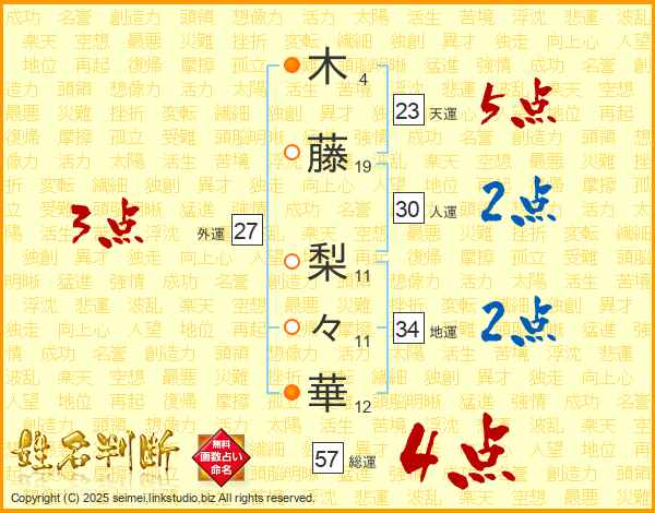 木(4画)藤(19画) 梨(11画)々(11画)華(12画)
