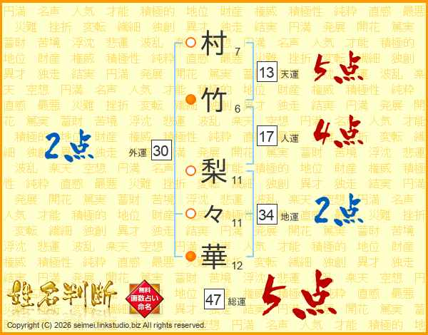 村(7画)竹(6画) 梨(11画)々(11画)華(12画)