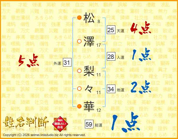 松(8画)澤(17画) 梨(11画)々(11画)華(12画)