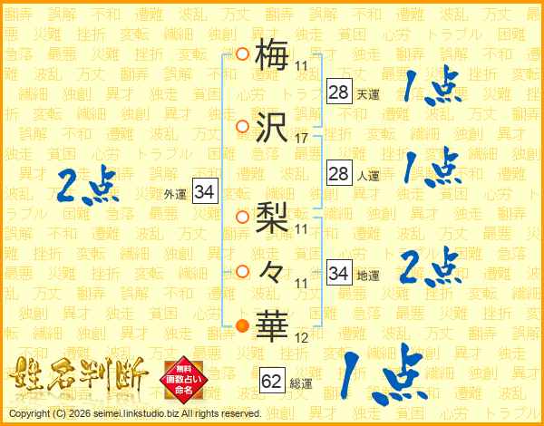 梅(11画)沢(17画) 梨(11画)々(11画)華(12画)