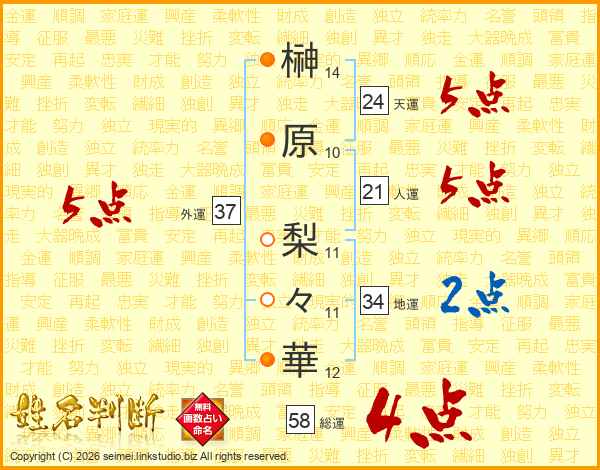 榊(14画)原(10画) 梨(11画)々(11画)華(12画)