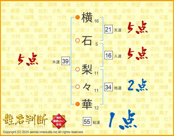 横(16画)石(5画) 梨(11画)々(11画)華(12画)