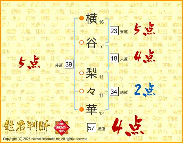 横(16画)谷(7画) 梨(11画)々(11画)華(12画)