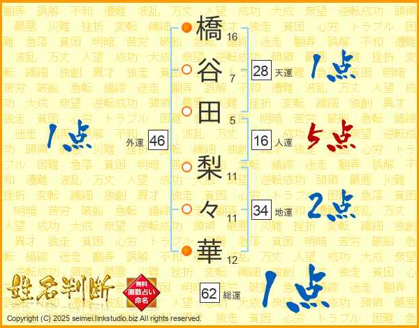橋(16画)谷(7画)田(5画) 梨(11画)々(11画)華(12画)