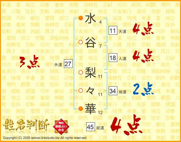 水(4画)谷(7画) 梨(11画)々(11画)華(12画)