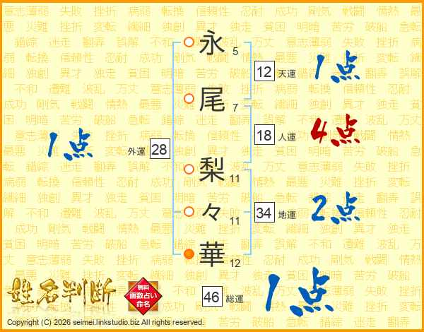 永(5画)尾(7画) 梨(11画)々(11画)華(12画)