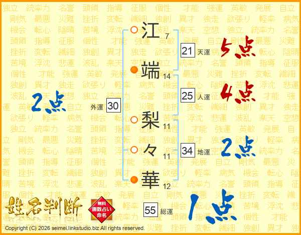 江(7画)端(14画) 梨(11画)々(11画)華(12画)
