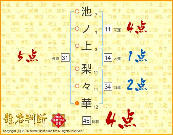 生活面を象徴する運勢です。外部から受ける影響力を表し、結婚運、家庭運や職場、環境への順応性を表します。総運から人運を引いた画数。姓や名が1文字の場合を除く。