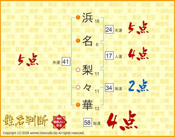 浜(18画)名(6画) 梨(11画)々(11画)華(12画)
