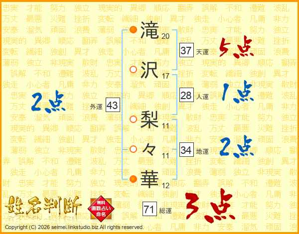 滝(20画)沢(17画) 梨(11画)々(11画)華(12画)