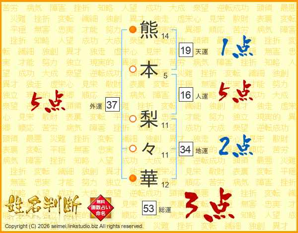 熊(14画)本(5画) 梨(11画)々(11画)華(12画)