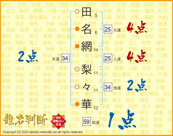田(5画)名(6画)網(14画) 梨(11画)々(11画)華(12画)