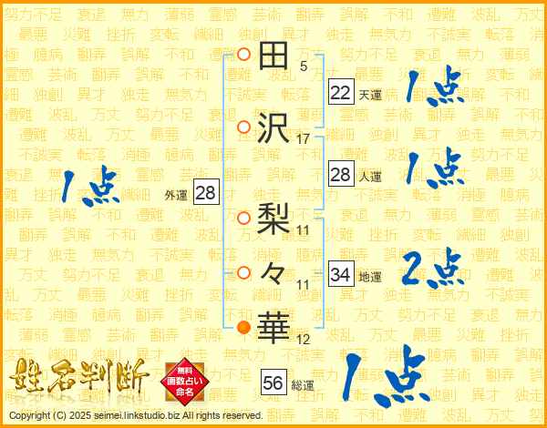 田(5画)沢(17画) 梨(11画)々(11画)華(12画)