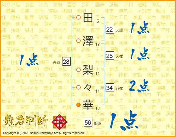 田(5画)澤(17画) 梨(11画)々(11画)華(12画)