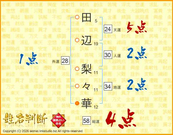田(5画)辺(19画) 梨(11画)々(11画)華(12画)