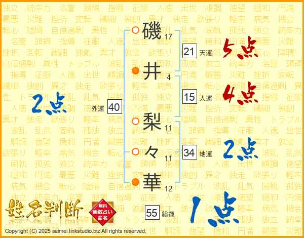 磯(17画)井(4画) 梨(11画)々(11画)華(12画)