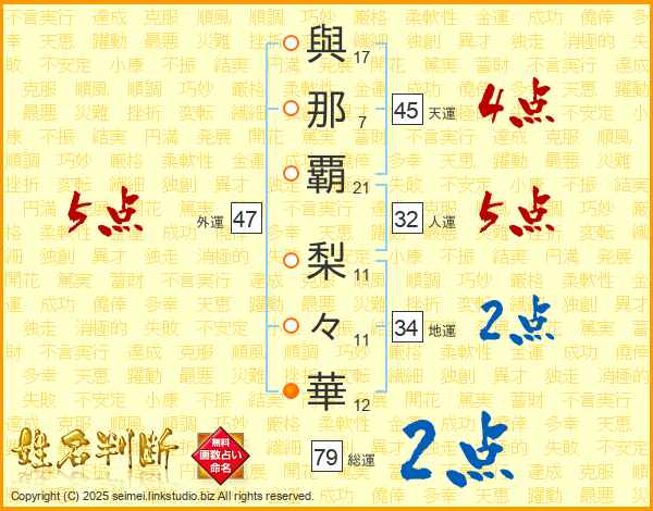 與(17画)那(7画)覇(21画) 梨(11画)々(11画)華(12画)