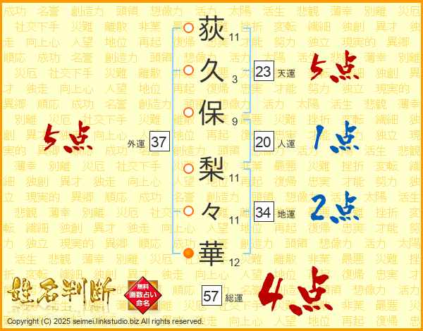 荻(11画)久(3画)保(9画) 梨(11画)々(11画)華(12画)