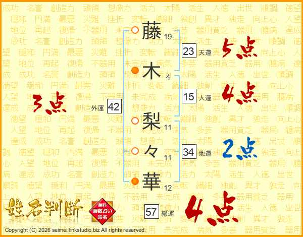 藤(19画)木(4画) 梨(11画)々(11画)華(12画)